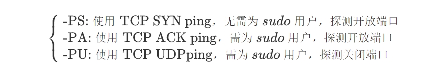 使用语法:sudo nmap -PS/-PA/PU[端口号] -sn 扫描IP,端口号默认为 80 端口